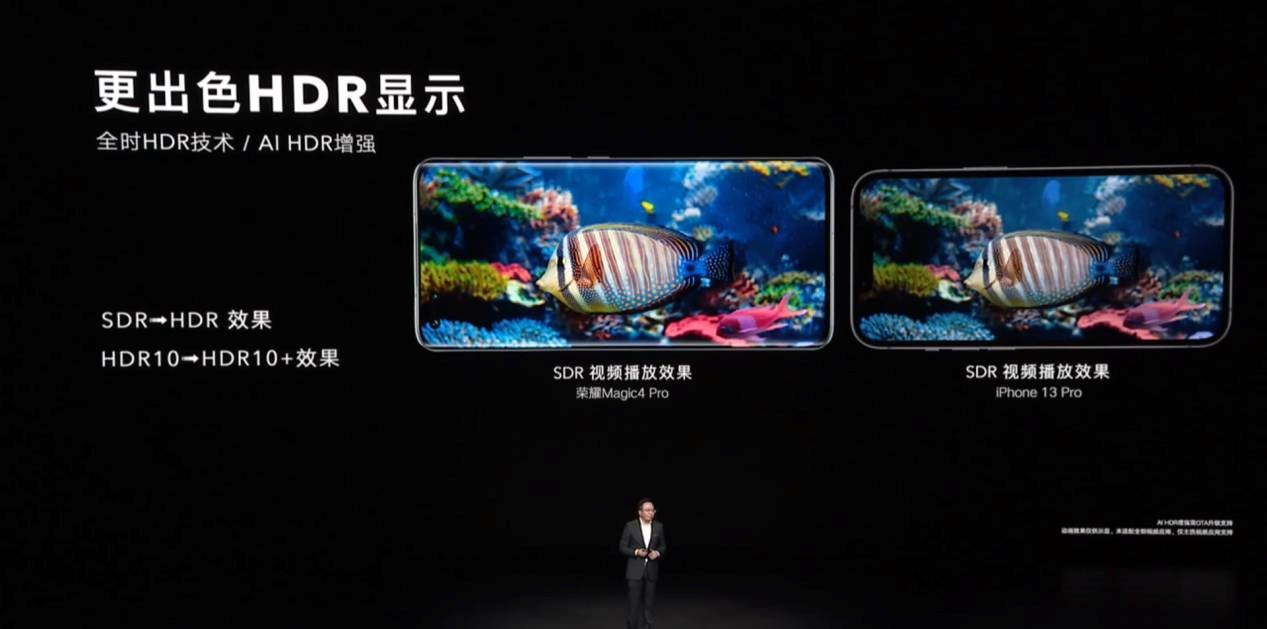 不仅如此,在荣耀Magic4 Pro以及荣耀Magic4 至臻版上,Pixelworks逐点半导体的动态自适应HDR技术还可实现画面从HDR10至HDR10+的动态效果提升。简单来说,HDR 10是将静态元数据发送到视频流,HDR 10+发送的是动态元数据,后者能够根据显示内容和环境光亮度,逐帧对屏显亮度、对比度、饱和度等显示参数进行调整,画质优化更细腻,显示效果更加真实通透。